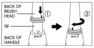 If you're looking at the back of the brush handle and brush head (as shown in the graphic above), you'll also see an embossed arrow on the metal part of the brush handle and a small embossed notch on the back of the brush head—you can slip the brush head on with these two marks lined up, then slightly twist the brush head clockwise until it locks into place.